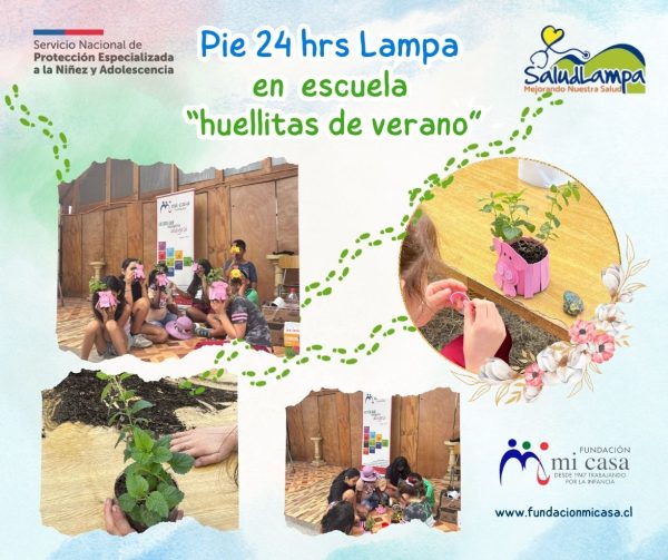 La Directora del programa Pie 24 horas, Nadia Castro y su equipo de profesionales, dentro de sus actividades de verano para los niños, niñas y adolescentes, participa en la escuela «huellitas de verano», donde se realizan talleres y actividades recreativas para distintos sectores de la comuna de Lampa (Sol de septiembre, Batuco, estación Colina y Lampa centro), gracias a la coordinación con el Servicio de Protección Especializada y el área de Salud de la Municipalidad de Lampa.